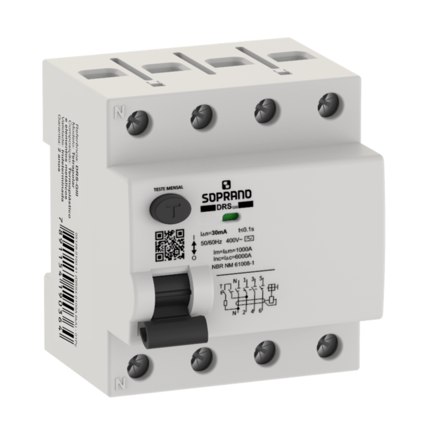 O Interruptor Diferencial Residual DRS-GIII da Soprano é um dispositivo de segurança essencial para proteger pessoas e instalações elétricas contra fugas de corrente. Com corrente nominal de 80A e sensibilidade de 30mA, o equipamento detecta rapidamente correntes de fuga para o terra e interrompe automaticamente o circuito, reduzindo significativamente o risco de choques elétricos.